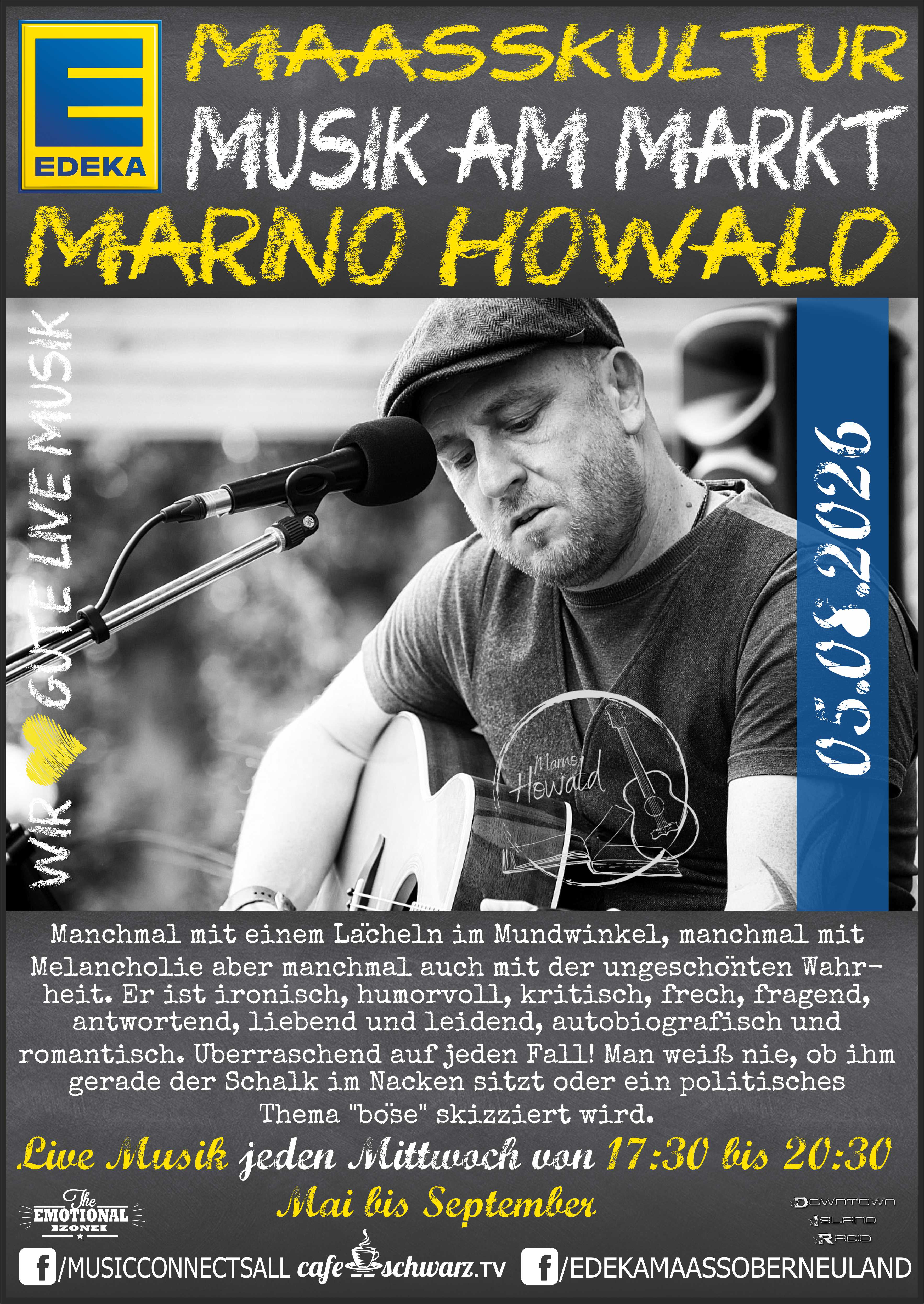 Jürgen Maaß der Inhaber des EDEKA Maaß in Bremen Oberneuland, wollte Kultur im Stadtteil schaffen und so schufen wir gemeinsam für 2023 in den Monaten Mai bis September die EDEKA MAAßKULTUR: Live und open air auf dem Marktplatz vor Ort. Live Musik vom feinsten für die Gäste, jeden Mittwoch in der Zeit von 17:30 bis 20:30 mit Pausen zum reden und kennenlernen der eingesetzten Musiker:Innen. Unterschiedlicheste Genres schaffen eine Dynamik und gleichzeitig die Möglichkeit unterschiedlichste Musikformen kennenzulernen. Sich einzulassen, neues zu entdecken, bekanntes zu bewundern, zuhören und mitsingen, beides ist möglich und schafft für das Publikum ein intensives emotionales Erlebnis.