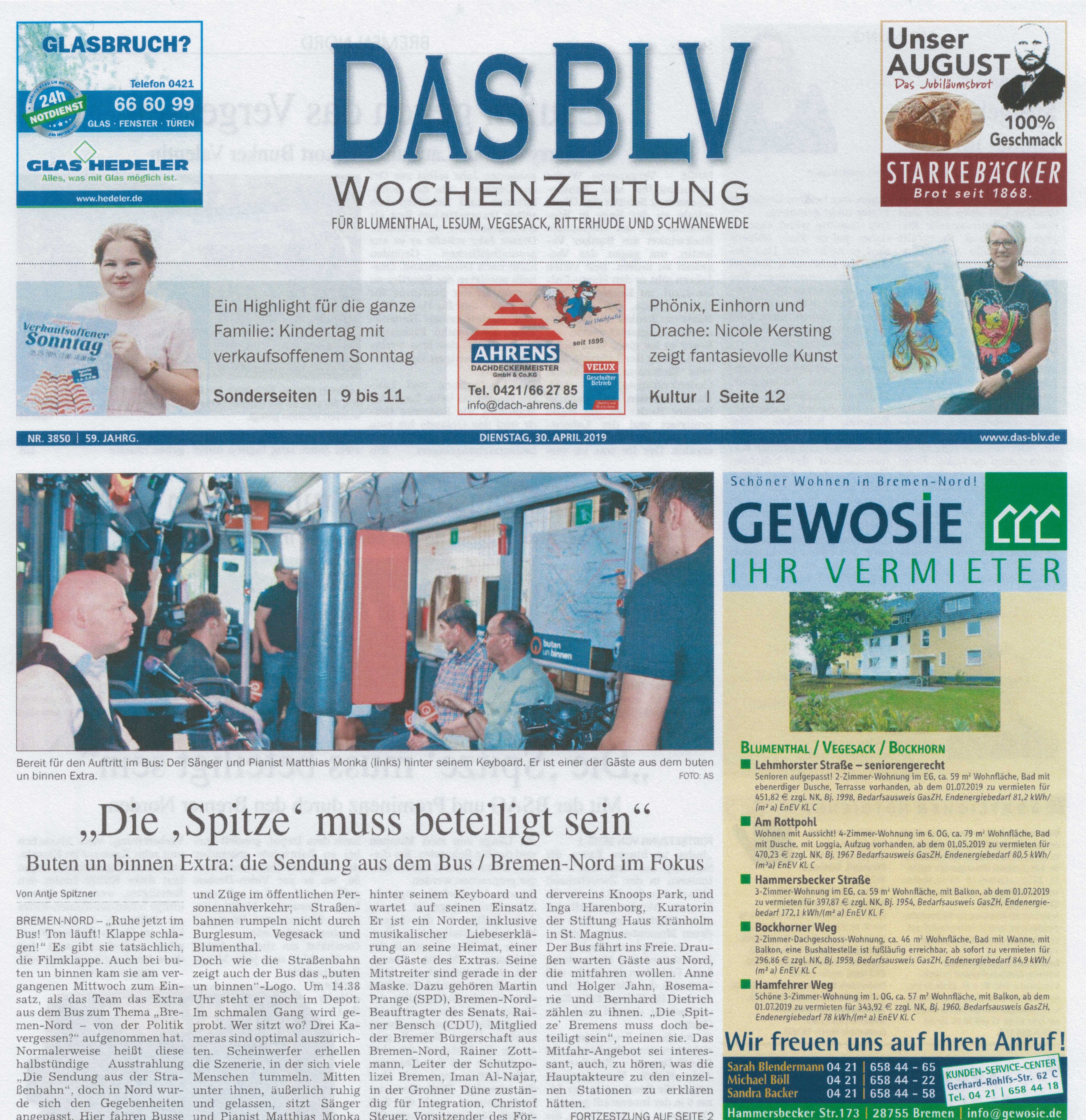 Und in Bremen gibt es das Lokalfernsehen Buten un Binnen! Und immer wieder ist in den Sendungen aus der Strassenbahn oder dem Bus Live Musik dabei!