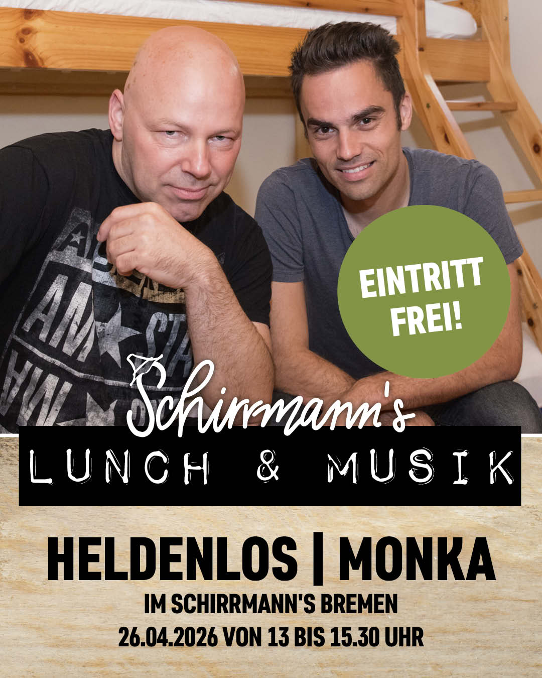 | 2026 | Schirrmann´s Lunch & Musik 2026 | SO | 26.04.2026 | Heldenlos | Monka |