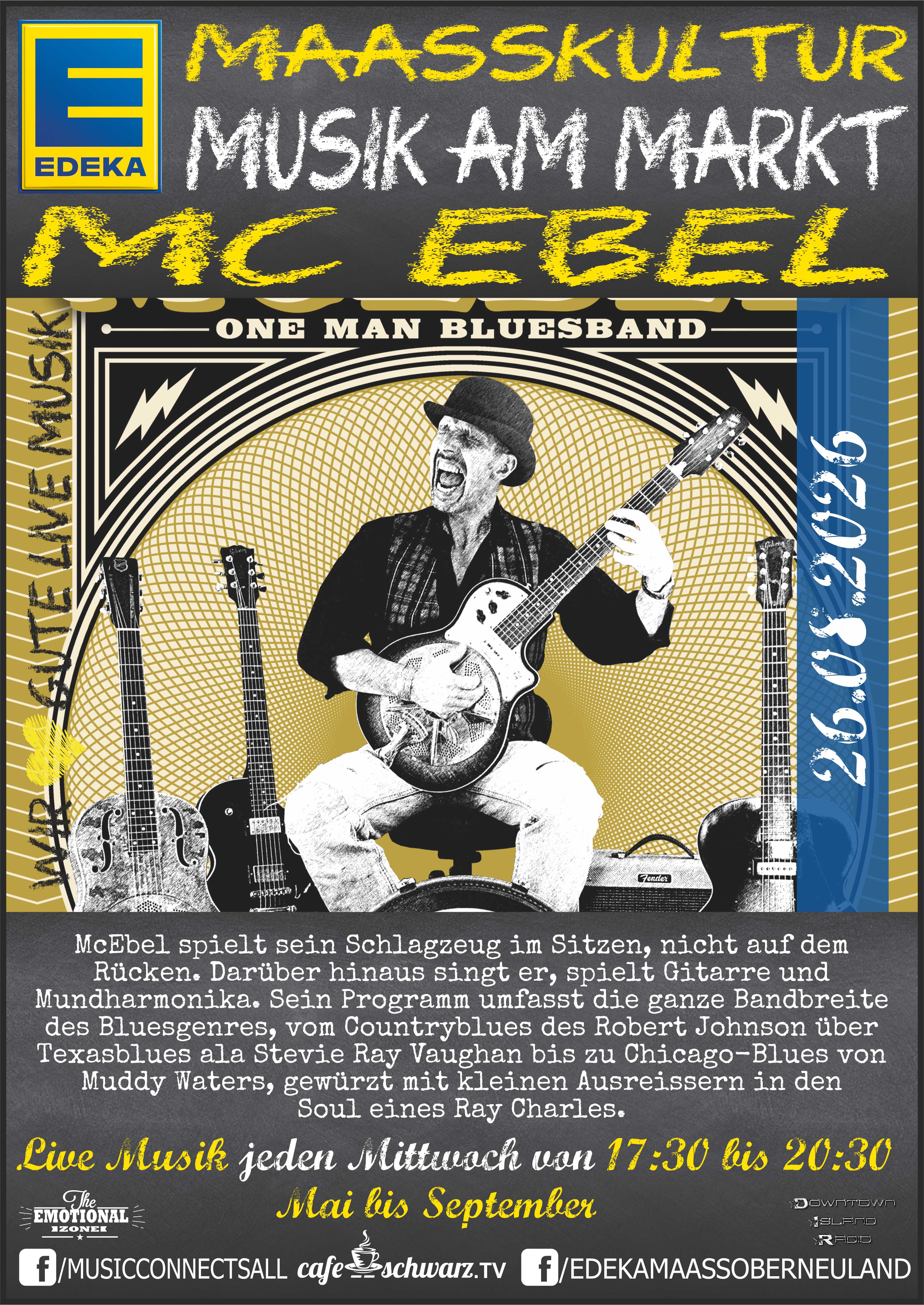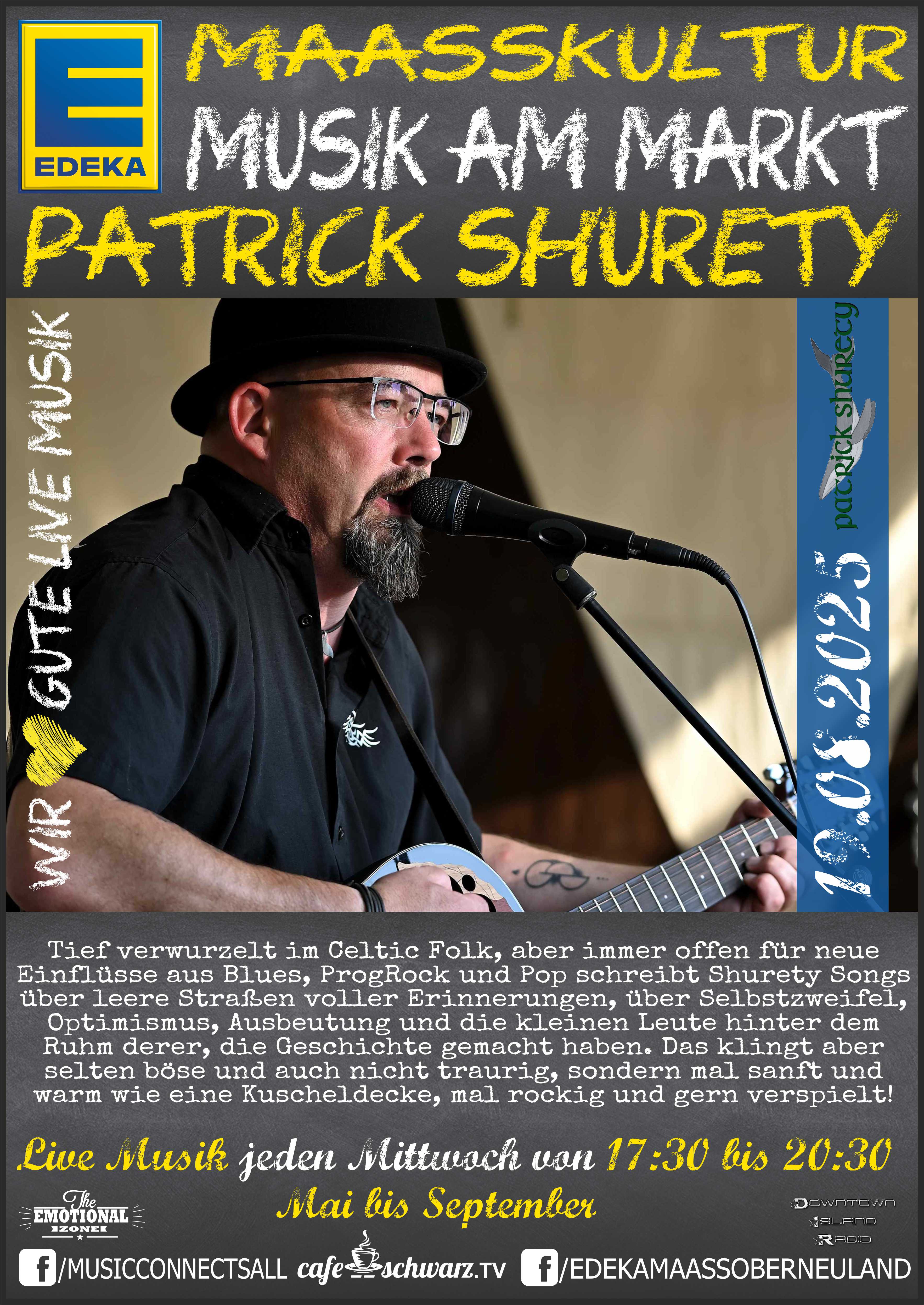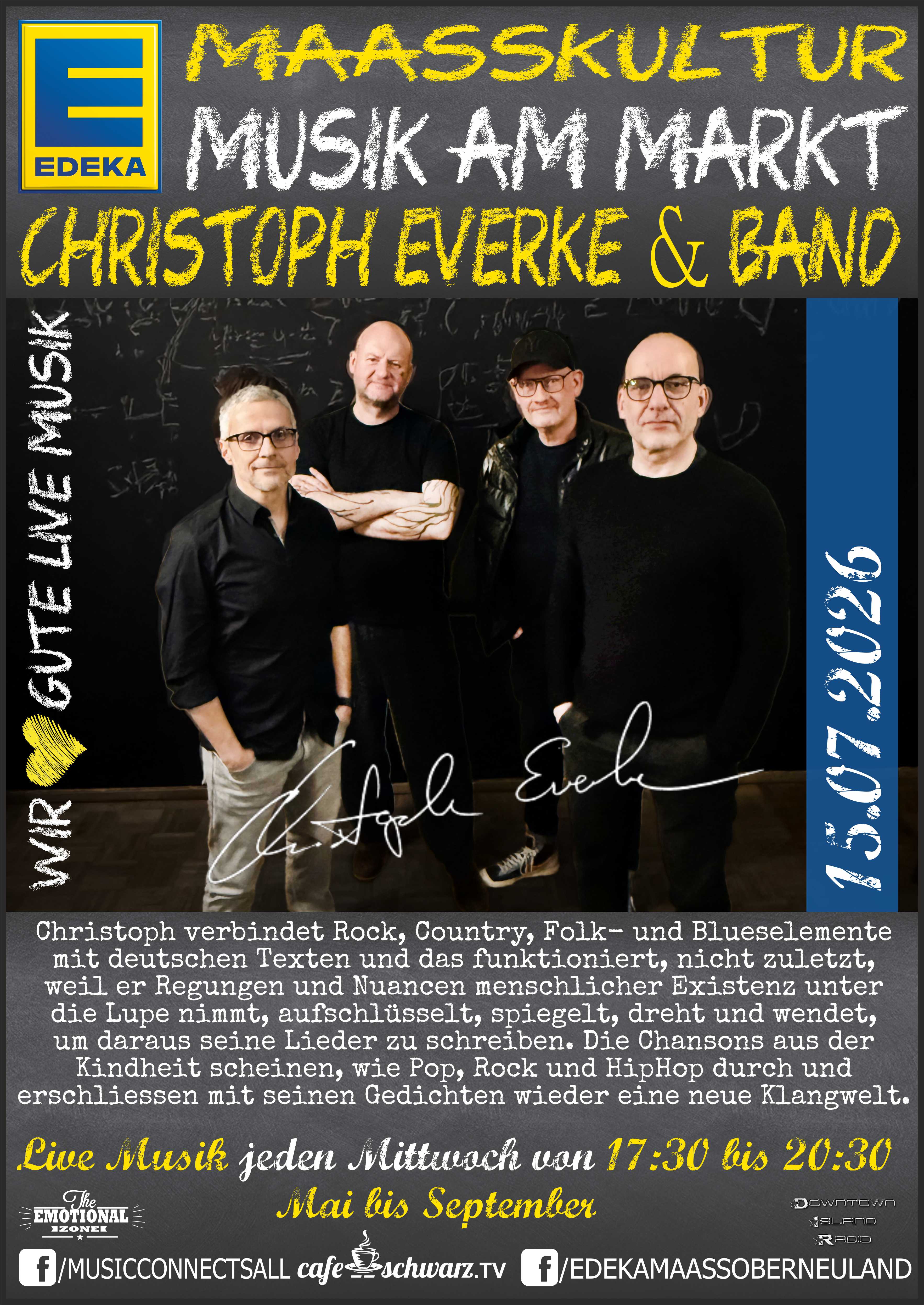 Jürgen Maaß der Inhaber des EDEKA Maaß in Bremen Oberneuland, wollte Kultur im Stadtteil schaffen und so schufen wir gemeinsam für 2023 in den Monaten Mai bis September die EDEKA MAAßKULTUR: Live und open air auf dem Marktplatz vor Ort. Live Musik vom feinsten für die Gäste, jeden Mittwoch in der Zeit von 17:30 bis 20:30 mit Pausen zum reden und kennenlernen der eingesetzten Musiker:Innen. Unterschiedlicheste Genres schaffen eine Dynamik und gleichzeitig die Möglichkeit unterschiedlichste Musikformen kennenzulernen. Sich einzulassen, neues zu entdecken, bekanntes zu bewundern, zuhören und mitsingen, beides ist möglich und schafft für das Publikum ein intensives emotionales Erlebnis.