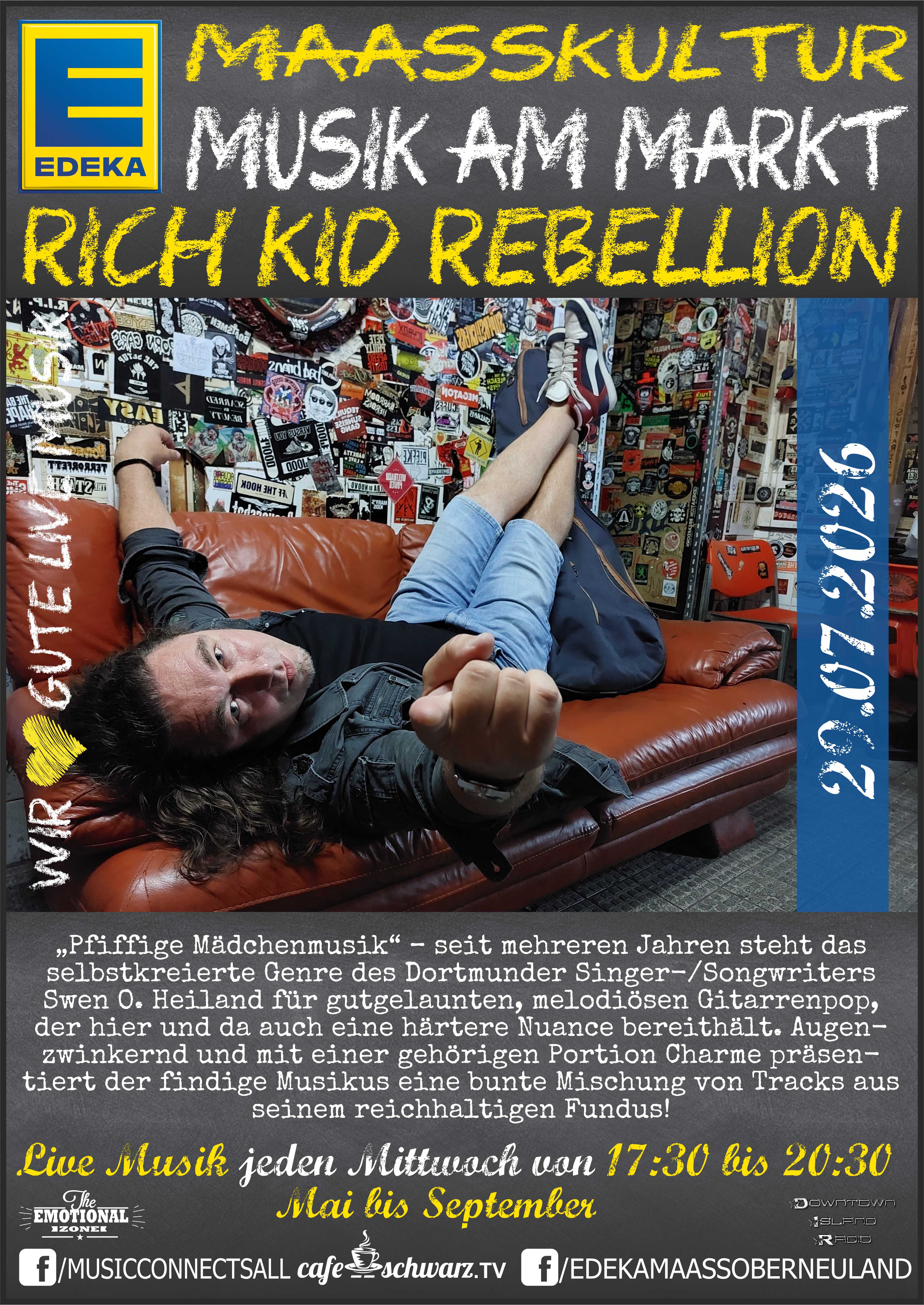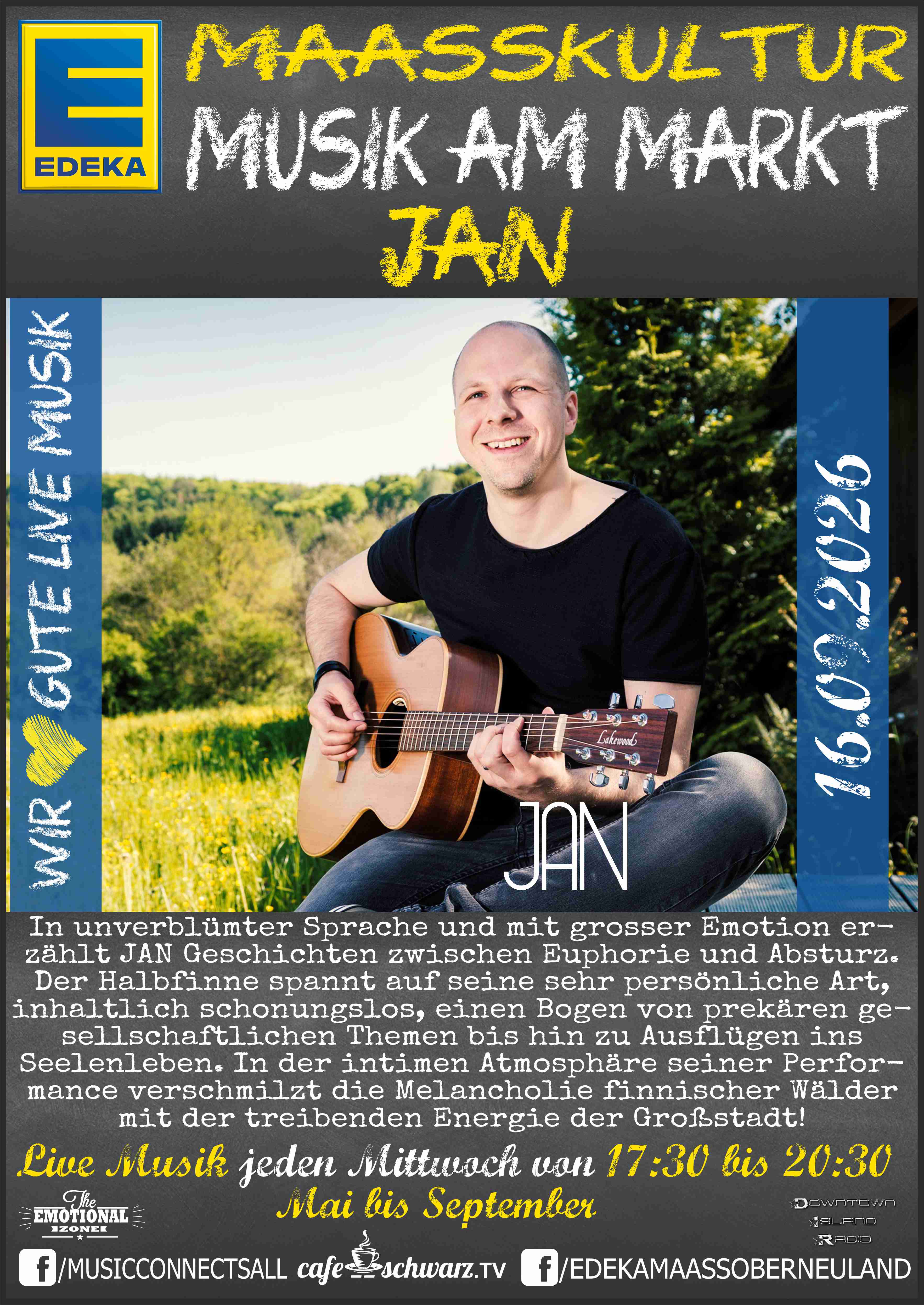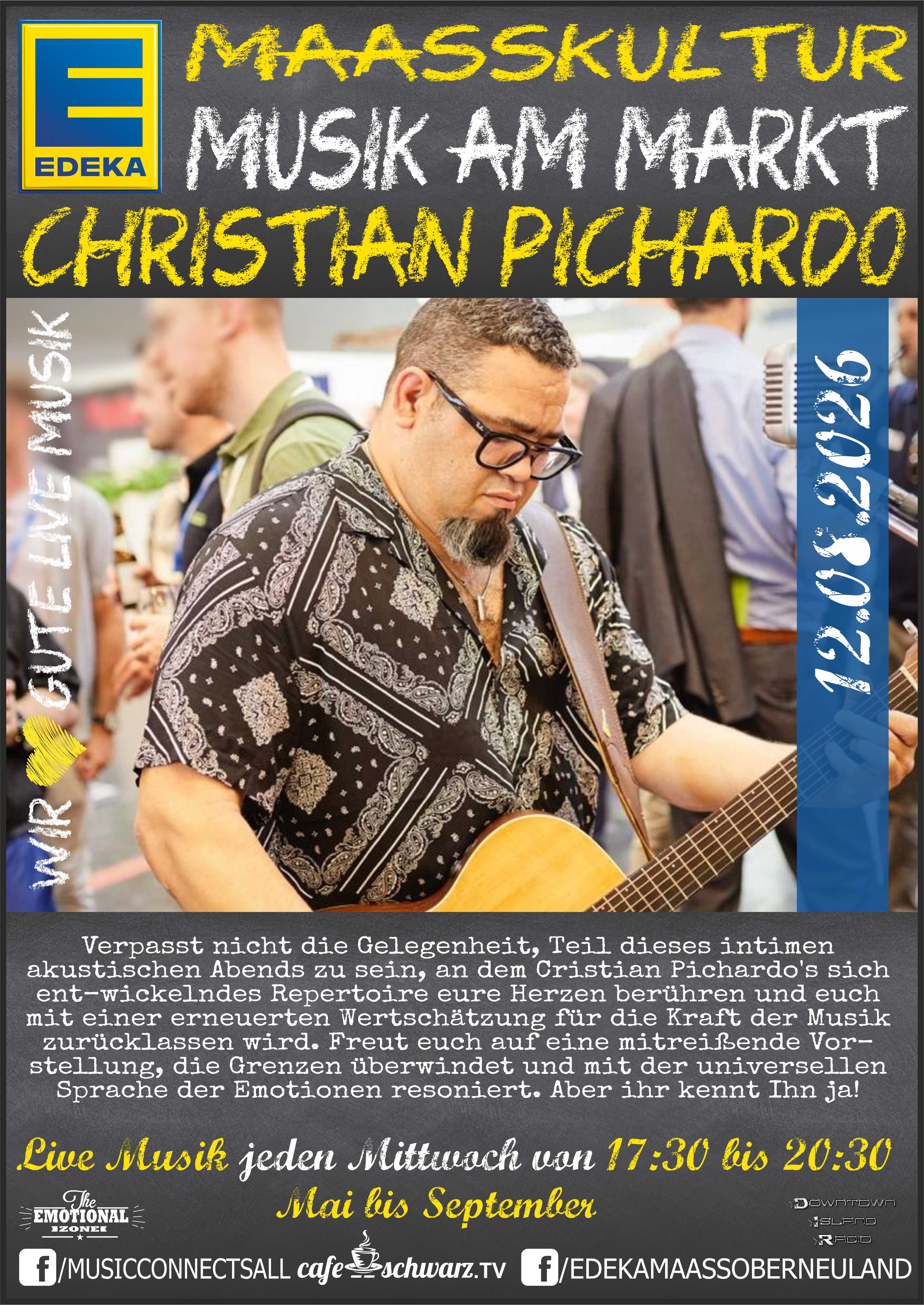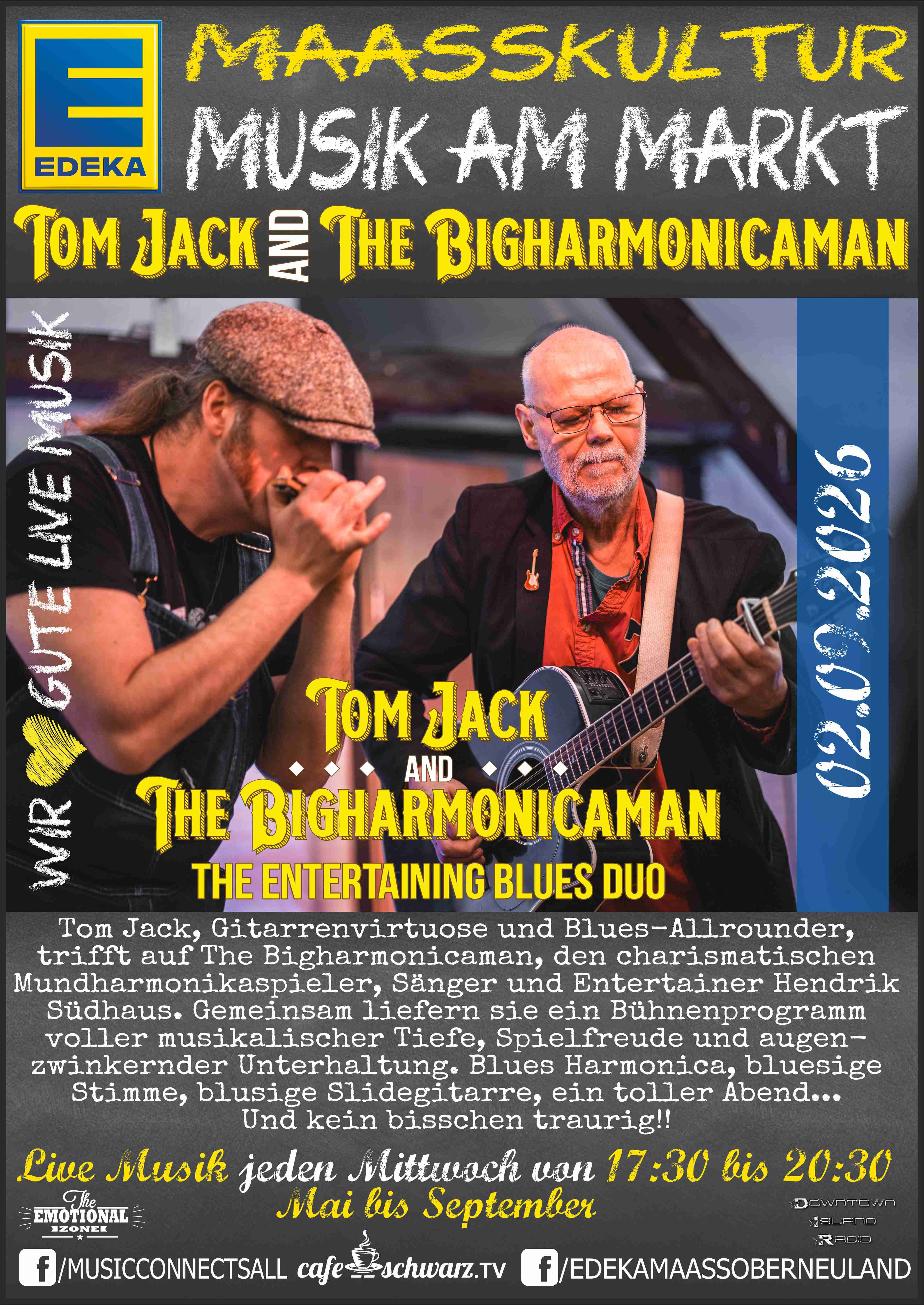 Jürgen Maaß der Inhaber des EDEKA Maaß in Bremen Oberneuland, wollte Kultur im Stadtteil schaffen und so schufen wir gemeinsam für 2023 in den Monaten Mai bis September die EDEKA MAAßKULTUR: Live und open air auf dem Marktplatz vor Ort. Live Musik vom feinsten für die Gäste, jeden Mittwoch in der Zeit von 17:30 bis 20:30 mit Pausen zum reden und kennenlernen der eingesetzten Musiker:Innen. Unterschiedlicheste Genres schaffen eine Dynamik und gleichzeitig die Möglichkeit unterschiedlichste Musikformen kennenzulernen. Sich einzulassen, neues zu entdecken, bekanntes zu bewundern, zuhören und mitsingen, beides ist möglich und schafft für das Publikum ein intensives emotionales Erlebnis.