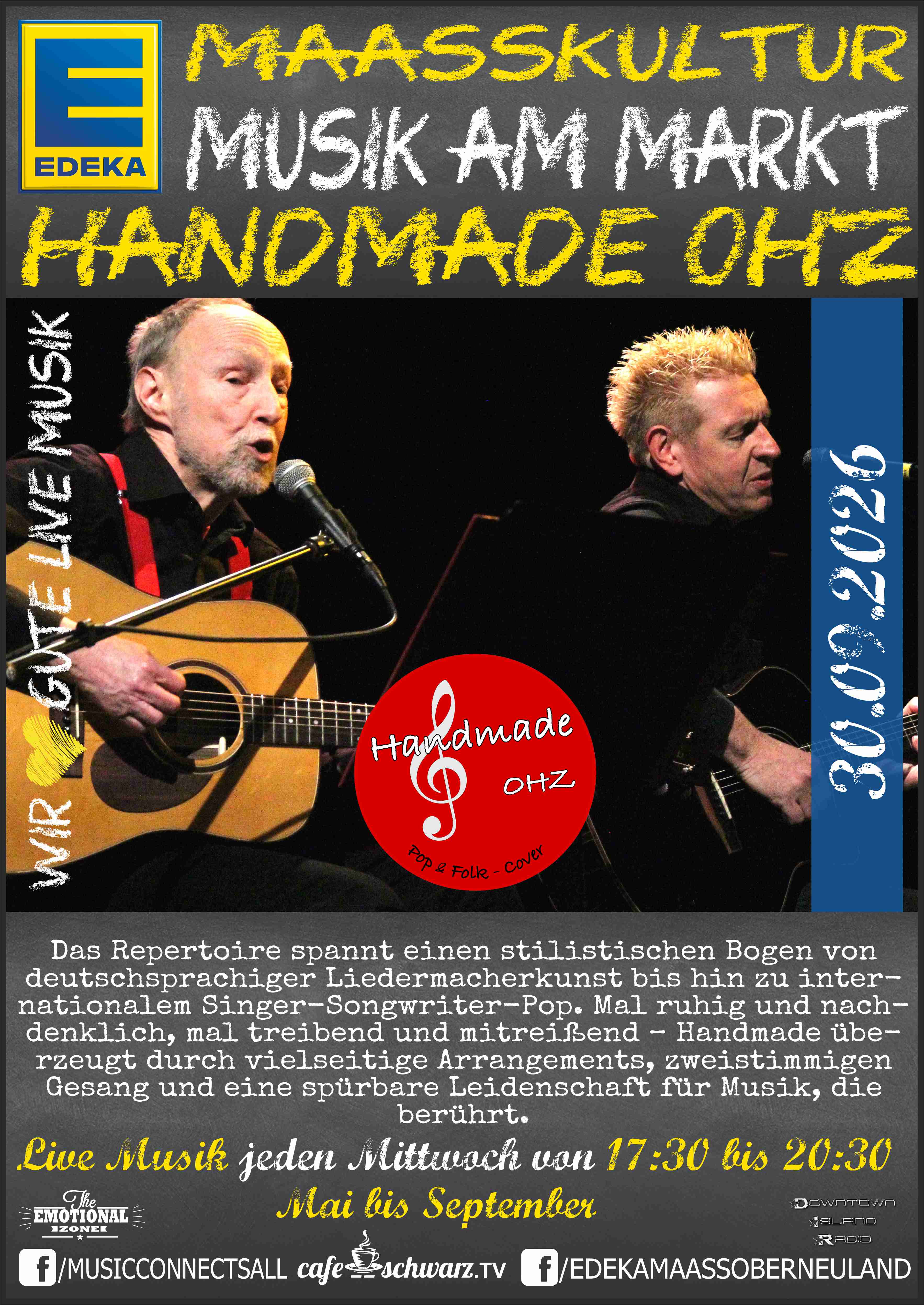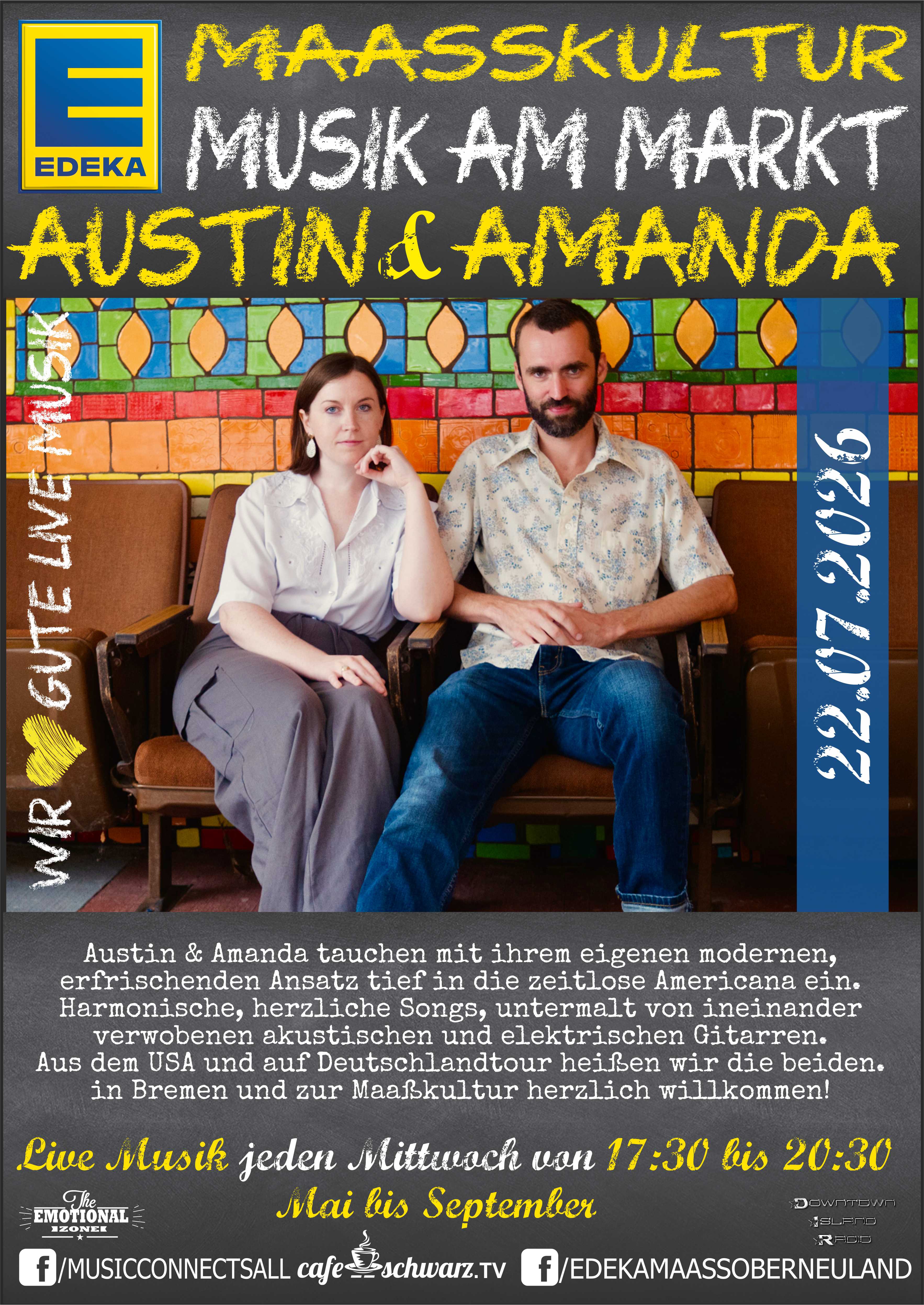 Der Heimatverein Oberneuland präsentiert, gemeinsam mit der Musik Agentur Emotional.Zone, der Veranstaltungs App Rausgegangen Oldenburg, DownTownIslandRadio und Cafe-Schwarz.TV Live Musik jeden 3. Mittwoch in den Monaten Oktober bis April. In der Zeit von 19:00 bis 21:00, wobei…, das Ende des Konzertes wird maßgeblich vom Publikum (also von Ihnen) mitbestimmt! Von Mai bis September übernimmt die EDEKA Maaßkultur dann jeden Mittwoch die open air Konzerte auf dem Marktplatz des Edeka Maaß Oberneuland.